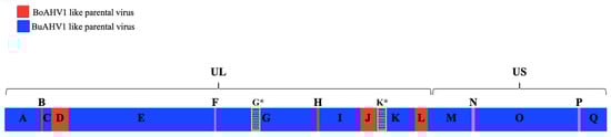 Proposed evolutionary origins of the BoAHV5 genome. The unique long (UL) and unique short (US) regions are indicated. Recombinant segments detected by both RDP4 and Simplot, derived from a BoAHV1-like parental virus, are identified by red blocks (segments A-E, G-M, O, and Q) or by pink blocks when recombinant segments show significance in less than 5 algorithms by RDP4 (segments F, N, and P); hatched yellow blocks represent recombinant events between BoAHV1-like and BoAHV-5 parental viruses detected only in the genome of Argentinian BoAHV5 strains (segments G* and K*). The blue regions represent the segments derived from a BuAHV1-like parental virus. The sizes of the different regions are drawn to scale.