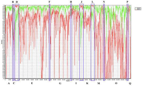 To confirm these recombination events based on RDP4 prediction analysis, the results were verified by Simplot (Figure 4). In this software, BoAHV1 and BuAHV1 whole-genome alignments were set as references and the BoAHV5 whole-genome alignment was set as the query. After a consensus of each viral type analysis, Simplot strongly supported the occurrence of the same recombination events detected by RPD4 (segments B, D, G, H, J, and L); however, it further considered another three regions of BoAHV5 genome as being of BoAHV1-like virus origin (segments F, N, and P). Although these regions had been detected by RDP4, they were not considered true events, due to weaker confidence by the detection methods in RDP4: segments F and N were significantly detected by only two algorithms (GENECOV and Bootscan), whereas segment P was significantly detected by only three algorithms (GENECOV, Bootscan, and 3Seq). These results are summarized in Table 1.