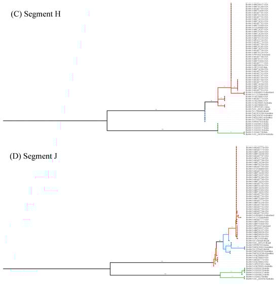 Of the eight BoAHV5 recombinant segments described here (Figure 3), five segments (B, D, H, J, and L) presented strong statistical evidence only in RDP4 to be classified as a true recombination event. The other three segments (F, N, and P) presented as a real recombinant in Simplot, whereas they showed weaker evidence in RPD4, as demonstrated by only achieving statistical significance in two or three (out of seven) algorithms used (Table 1 and Figure 4). We ultimately decided to define the segments F, N, and P as true recombinants, based on the phylogenetic analysis of each segment individually (Figure 6). When each segment was compared against the equivalent BoAHV1 and BuAHV1 genomic regions, they strongly clustered with BoHAV-1, similarly to fragments B, D, H, J, and L. Thus, all the eight segments identified can be considered as true recombination events, evidenced by the grouping upon phylogenetic analysis.