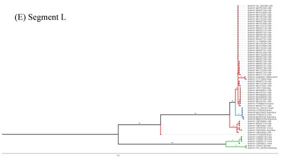 The evolution of alphaherpesviruses shows that the occurrence of closely related viruses and host shifts (spillovers) favor the emergence of recombinant viruses that could infect different species []. Recombination has been detected previously in alphaherpesviruses [,,]. Interspecies recombination events have been reported both in vitro and in vivo between human alphaherpesviruses 1 and 2 []. Recombination events have also been reported between equine alphaherpesviruses (EqAHVs), particularly between EqAHV1 and EqAHV4, and between EqAHV4 and EqAHV9 []. In cattle, the first evidence of in vitro interspecies recombination between BoAHV1 and BoAHV5 was reported by Maurens et al. []. The first evidence of natural recombination between two species of bovine alphaherpesviruses was reported by Maidana et al. []. In that study, three field BoAHV5 isolates (MW829288, MZ420492, and MZ364295) were identified as recombinants between BoAHV1 and BoAHV5; additionally, two recombination hotspots were detected in the UL27 gene, which encodes gB. These findings suggested that the BoAHV5b subtype should be considered a natural recombinant between BoAHV1.2b and BoAHV5 []. Recently, ref. [] obtained the complete genomes of these natural recombinants, and the analyses showed a second recombination event in two of the three viruses in the segment encoding the UL11, the UL10, and part of the UL9 genes. This new recombination seems to have originated independently from the first recombination event involving gB []. In those studies, co-circulation and coinfection of related viruses within a herd or country seem to be prerequisites for recombination to take place. The results presented here corroborate the results of those authors; both recombination events were detected here (shown in Figure 3 as segments G* and K*) in our analysis. The fact that those particular recombination events were restricted to Argentinian BoAHV5 strains could suggest a more recent event in bovine herpesvirus evolution.