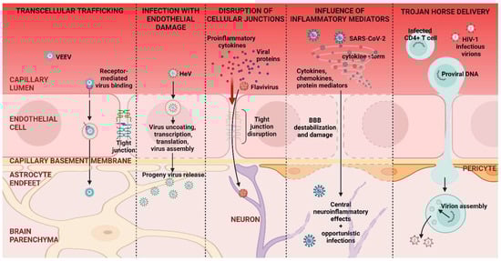 Mechanisms of virus entry into the central nervous system (CNS) through the blood–brain barrier (BBB). Viruses present in the systemic circulatory system can infiltrate the CNS by breaching the brain endothelial cells through various mechanisms. These include the following: transcellular trafficking without causing cellular damage; endothelial infection with damage; paracellular migration with the direct disruption of cellular junctions by viral proteins and with the participation of pro-inflammatory cytokines produced by activated barrier cells; disruption of the BBB with the involvement of pro-inflammatory cytokines and bioactive mediators that disrupt cell homeostasis, destabilize cellular junctions, and lead to the damage of cells composing the BBB; Trojan horse delivery within infected cells. For each of these mechanisms, viruses that exploit the pathway to infect the CNS are mentioned.