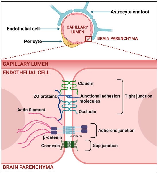 One of the most prominent roles of the BBB is the precise regulation of paracellular, and thus vascular, permeability, which is attained with junction complexes that include tight, adherens, and gap junctions connecting endothelial cells [8,9]. Tight junctions (TJs) consist of integral membrane proteins such as occludins and claudins, with claudin-5 being the major constitutive claudin of the BBB. The TJ also comprise additional junctional adhesion molecules, cytoplasmic accessory zonula occludens phosphoproteins, and others [10]. The TJs provide low paracellular permeability to ions and small molecules and are major contributors to BBB properties [11]. The adherens junctions present a similar organization to the TJ and consist of cadherins and supporting catenins, and these regulate signaling processes as well as secure cell–cell adhesion [8]. Gap junctions consist of proteins from the connexin family [12], and play a role in cell proliferation and migration beyond intercellular communication [13]. The cytoskeleton linked to junction scaffolding proteins is also an indispensable component of intercellular connections. The types of junctions between BBB endothelial cells are depicted in Figure 2.