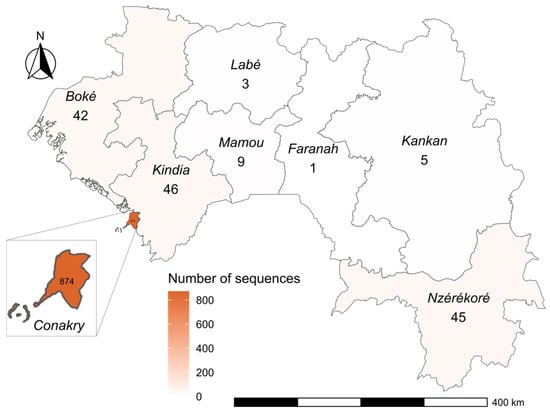 Geographically, Guinea is subdivided into eight administrative regions. Of the total sequences generated, 84% (874/1038) were from samples collected in Conakry, the country’s capital city, were many of the administrative departments and the international airport are located. Genomic surveillance also covered the prefectures of Kindia 4.4% (46/1038), Nzérékoré 4.3% (45/1038), Boké 3.9% (42/1038), Mamou 0.9% (9/1038), Kankan 0.5% (5/1038), and Labé 0.3% (3/1038) (Figure 2).