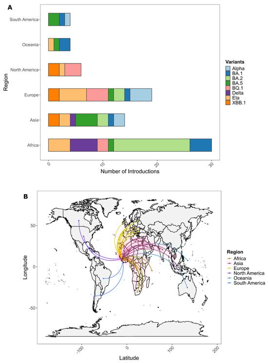 Figure 4. (A) Number of importation events by world region of severe acute respiratory syndrome coronavirus 2 (SARS-CoV-2) lineages (Alpha, Eta, Delta, Omicron {BA.1, BA.2, BA.5, BQ.1, XBB.1}, and sublineages) into Guinea from March 2020 to December 2023. (B) Geographical distribution of the importations.
