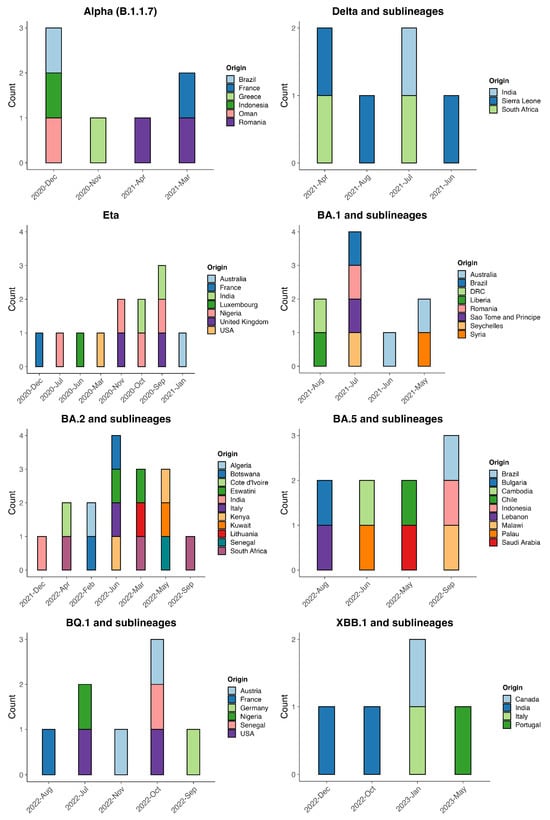 Figure 5. Number and origin of importation events of the different SARS-CoV-2 lineages (Alpha, Eta, Delta, Omicron {BA.1, BA.2, BA.5, BQ.1 and XBB.1.5}, and sublineages) into Guinea between March 2020 and December 2023.