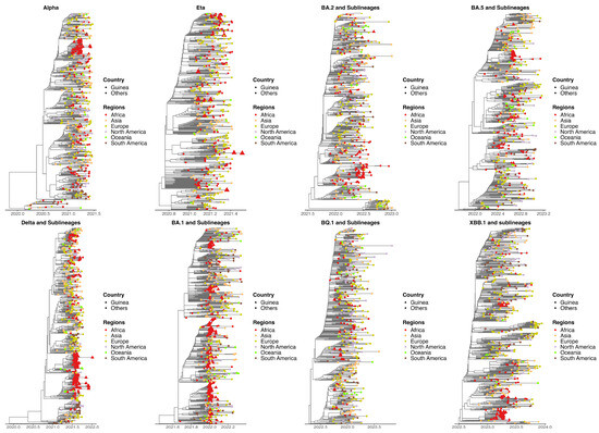 We carried out a phylogeographic analysis on all the variants of concern (VOCs) that circulated in Guinea to determine the probable origin of the different variants and the dates of introduction of these strains into the country. The variants analyzed were Alpha (B.1.1.7), Delta (B.1.617.2), Eta (B.1.525), Omicron (BA.1, BA.2, BA.5, BQ.1, and XBB), and sublineages. The datasets include sequences for Alpha (2975 genomes, including 50 from Guinea), Delta (3729 genomes, including 108 from Guinea), Eta (3502 genomes, including 26 from Guinea), BA.1 and its sublineages (2303 genomes, including 173 from Guinea), BA.2 and its sublineages (2934 genomes, including 32 from Guinea), BA.5 (1750 genomes, including 44 from Guinea), BQ.1 and its sublineages (1729 genomes, including 108 from Guinea), and XBB.1 and its sublineages (2404 genomes including 106 from Guinea).