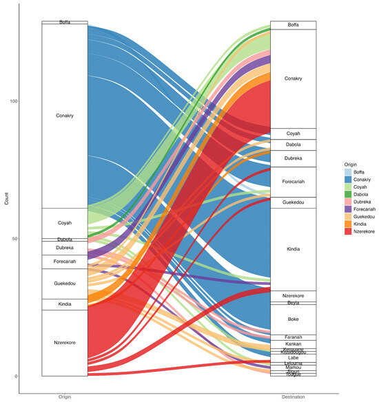The majority of inter-regional introductions within Guinea originated from Conakry, with this region accounting for 67 out of 129 cases (51.9%); the next-most-frequent origins were Nzérékoré, with 24 cases (18.6%), and Coyah and Gueckedou, each contributing 11 cases (8.5%). The first introduction of SARS-CoV-2 was inferred to have reached Conakry from an unidentified source. Subsequent migration movements were observed from Conakry to Coyah (and vice-versa), as well as from Conakry to Gueckedou, Dubreka, and Boffa. Cases were also exported from Nzérékoré to other regions of the country, including Conakry, Kindia, Gueckedou, Forékaria, and Labé (Figure 7).