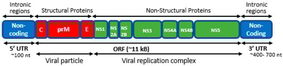 The genome of the dengue virus (DENV) is approximately 11 kilobases long and consists of a positive sense single-stranded RNA (ssRNA) [11]. It features a single, extensive open reading frame (ORF) flanked by two untranslated regions [12], namely the 5′-UTR and 3′-UTR. The 5′-UTR measures approximately 95–101 nucleotides in length [13] and encompasses several significant elements, including SLA, SLB, 5′UAR, 5′DAR, cHP, and 5′CS [14]. Stem-loop A (SLA) functions as a promoter for the viral RNA-dependent RNA polymerase (NS5). Stem-loop B (SLB) contains essential sequences for long-range RNA–RNA interaction and genome replication. The 5′-upstream AUG region (5′-UAR) and the 5′-downstream AUG region (5′-DAR) are involved in genome cyclization. The C-coding region hairpin (cHP), responsible for translation initiation from the C-start codon and 5′-cyclization sequence (5′-CS), mediates RNA–RNA interaction between the 5′- and 3′-ends of the viral genome, which are essential for genome cyclization. The ORF encodes both structural and non-structural proteins, which are translated into a polyprotein and processed co- and post-translationally by cellular and viral proteases to produce ten mature viral proteins. The structural proteins include the capsid (C), pre-membrane/membrane (prM/M), and envelope (E) proteins, while the non-structural proteins include NS1, NS2A, NS2B, NS3, NS4A, NS4B, and NS5 [15,16]. These proteins are involved in various aspects of RNA replication and viral assembly, as shown in Figure 1.