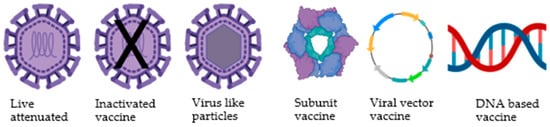 Live attenuated vaccines are made up of weakened forms of living pathogens that have been altered to be less harmful or non-pathogenic. These forms of vaccines offer the advantage of delivering a range of protective antigens and providing long-term immune protection. Various live dengue attenuated vaccines have been developed using recombinant DNA technology, including the chimeric yellow fever 17D (YF17D) virus–tetravalent dengue vaccine (CYD-TDV), the recombinant DENV-4 mutant with a 30-nucleotide deletion vaccine (rDEN4∆30), and the tetra-live attenuated virus dengue vaccine (DENVax) shown in Figure 3 [29]. Several vaccine formulations are at different stages of development at various organizations. So far, only one has been licensed for use, and several other vaccines are in clinical trials.