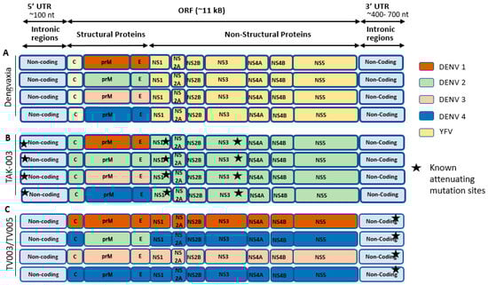 Types of live attenuated tetravalent dengue vaccines. The schematic represents live attenuated tetravalent dengue vaccine formulations. (A) Dengue genome components of Sanofi’s Dengvaxia consist of the YFV-17D virus backbone (indicated in yellow) to facilitate the expression of the prM and E genes from DENV1, DENV2, DENV3, and DENV4. (B) TAK-003 contains an attenuated DENV2 strain backbone (green) and three chimeric virus strains expressing the prM and E genes of DENV1 (brown), DENV3 (pink), and DENV4 (blue). (C) NIH/ Bhutantan (TV003/TV005) TV003/TV005 comprises three complete DENV strains that include the entire DENV genome (both structural and non-structural genes) along with one chimeric virus, where the prM and E genes of DENV4 are replaced with those of DENV2. These viruses are rendered attenuated by a common deletion of either 30 nucleotides (Δ30) or 31 nucleotides (Δ31) in the 3′ UTR of the viral genome. C: capsid; prM: pre-membrane; E: envelope; NS: non-structural proteins.