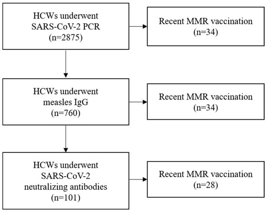In Korea, when small outbreaks occurred in Korea, healthcare workers (HCWs) were required to have their immune status evaluated, and our hospital also evaluated the overall immune status of HCWs for measles [11]. We could also determine the immunogenicity of SARS-CoV-2 through the sample. Thus, we conducted this study to evaluate the effectiveness and immunogenicity of the MMR vaccine against SARS-CoV-2 in HCWs at one medical institution.