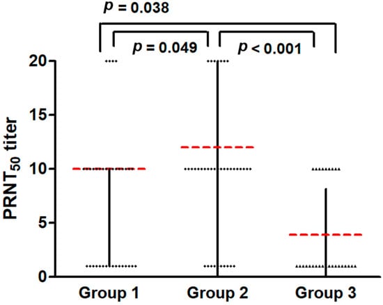 Comparison of SARS-CoV-2 neutralizing antibody titers in each group according to measles immunity status. Group 1: natural immunity; Group 2: vaccine-induced immunity; Group 3: vaccine failure. Abbreviation: SARS-CoV-2, severe acute respiratory syndrome coronavirus 2; PRNT50, 50% plaque reduction neutralization test. The red lines and black dotted lines are the median and interquartile range values of PRNT50 titer in each group.