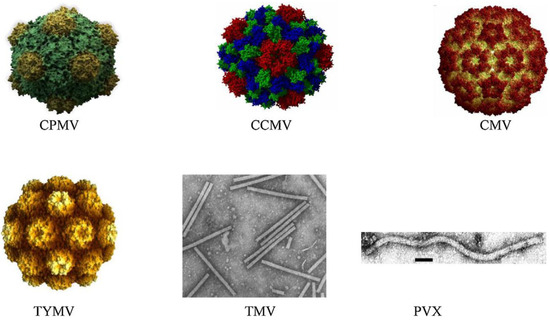 Schematic representation of plant viruses with capsid structures of various shapes (Icosahedral Cowpea mosaic virus (CPMV), Cowpea chlorotic mottle virus (CCMV), Cucumber mosaic virus (CMV), Turnip yellow mosaic virus (TYMV), Rod-shaped Tobacco mosaic virus (TMV), Potato virus X (PVX)) from reference [23] with permission.