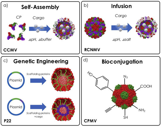 Illustrations of various approaches to loading cargo into VLPs, including (a) utilizing pH and buffer condition adjustments to allow for self-assembly around the cargo (demonstrated with CCMV); (b) infusing cargo into RCNMV through modifications in pH and salt concentrations; (c) applying genetic engineering to attach scaffolding proteins to encapsulate drugs within P22 and (d) using bioconjugation to attach cargo to CPMV by targeting residues on its external surface. Permission was obtained from the publisher of [7].