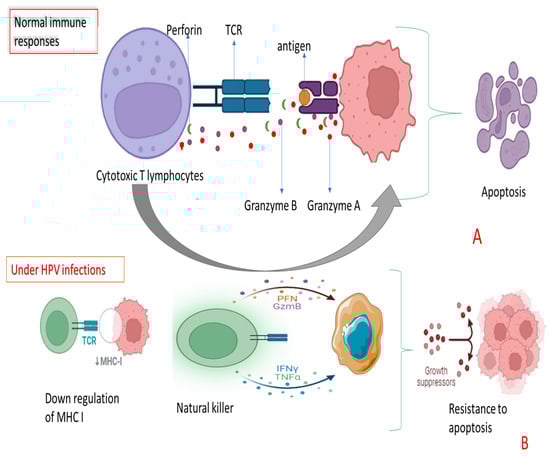 Some HPV strains have evolved mechanisms to evade immune responses, including resistance to perforin and granzyme-induced apoptosis [101]. For instance, HPV can inhibit the activation of immune cells or interfere with apoptotic pathways in infected cells, allowing the virus to persist in the host and increasing the risk of developing cancer [19].