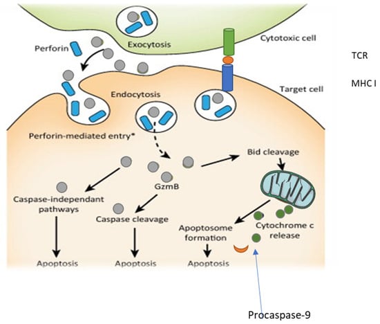 Granzymes then enter the cell through these pores to execute their lethal function. Once inside the target cell, different granzymes trigger distinct biochemical pathways leading to apoptosis. Granzyme B is especially important, as it activates caspases, which are enzymes that break down key proteins in the cell and initiate the apoptotic cascade [90]. Granzyme B can also directly cleave proteins within mitochondria, leading to the release of cytochrome c, further promoting apoptosis. Granzyme A, on the other hand, induces a caspase-independent form of cell death by damaging nuclear DNA and activating alternative cell death pathways [91]. Granzymes are critical in the immune response against viral infections, tumors, and certain intracellular bacteria. By inducing apoptosis, granzymes help eliminate infected or transformed cells without causing widespread inflammation or damage to the tissues. This targeted killing is a hallmark of the immune system’s precision and efficiency.