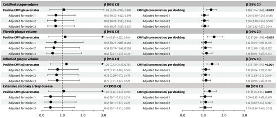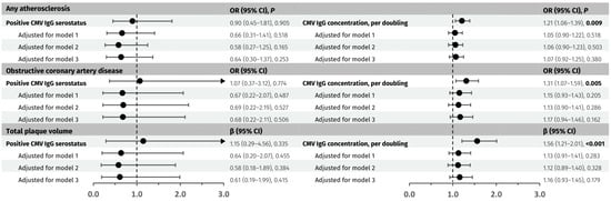 - Schnittman, S.R.; Lu, M.T.; Mayrhofer, T.; Burdo, T.H.; Fitch, K.V.; McCallum, S.; Fulda, E.S.; Zanni, M.V.; Foldyna, B.; Malvestutto, C.; et al. Cytomegalovirus Immunoglobulin G (IgG) Titer and Coronary Artery Disease in People with Human Immunodeficiency Virus (HIV). Clin. Infect. Dis. 2023, 76, e613–e621. [Google Scholar] [CrossRef]