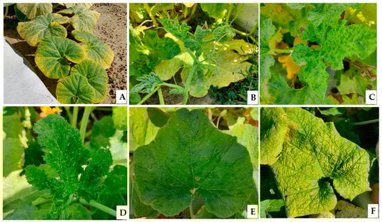 In both years, cucurbit plants were observed visually for the development of virus symptoms and assessed weekly. At 45 days after seed sowing (DAS), infected plants showing severe symptoms, including leaf yellowing, chlorotic spots, shoestring, curling, crumpling, mosaic, adaxial, and abaxial blistering on leaves, were collected.
