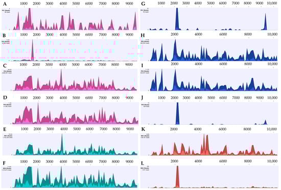 Read coverage maps of the genome of the zucchini yellow mosaic virus (ZYMV) and papaya ringspot virus (PRSV) detected by high-throughput sequencing (HTS) of small RNAs of symptomatic pumpkin and winter squash samples. The data were analyzed using CLC Genomics workbench v23.0.2. The colored heatmap shows the coverage with several reads. A to F represent read coverage maps of the ZYMV for samples with (A) marginal yellowing (PK1), (B) cupping and shoestring (PK2), (C) mosaic and vein clearing (PK3), (D) thickening, curling, crumpling, and vein clearing (PK4), (E) light and dark green mosaic and blistering (WS1), and (F) yellowing, thickening, and inward rolling (WS2). On the other hand, G to L shows read coverage maps of the PRSV for (G) PK1, (H) PK2, (I) PK3, (J) PK4, (K) WS1, and (L) WS2. Genome positions of the virus are presented to scale above the histograms, and the coverage in the number of reads with reference genomes (GenBank accession number NC_003224 for ZYMV and NC_001785 for PRSV) is represented on the Y-axis. The colors in the specified aggregation bucket mean the maximum, average, and minimum coverage values (read counts) from top to bottom.