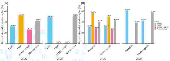 Graphs showing the prevalence of zucchini yellow mosaic virus (ZYMV) and papaya ringspot virus (PRSV): (A) bar graphs showing the prevalence of ZYMV and PRSV between the two consecutive years, 2022–2023, among the total samples collected; (B) distribution of ZYMV and PRSV in pumpkin and winter squash in 2022–2023.