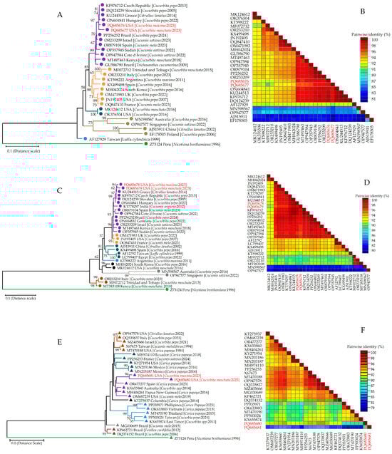 To further confirm the ATV in pumpkin and winter squash, PCR and Sanger sequencing were performed. A phylogenetic study and heat map of ZYMV-encoded CP (Figure 5A,B) and HC-Pro (Figure 5C,D) suggested a close evolutionary history with the European isolates. ZYMV infects cucurbit crops primarily (winter squash, pumpkin, melon, sponge gourd, snake gourd, zucchini, and cucumbers) in several countries, including the USA [,,,]. In contrast, PRSV infected both cucurbits and papaya, suggesting a diverse host range []. PRSV-CP (Figure 5E,F) and PRSV-NIa-Vpg (Figure 5G,H) based phylogeny shows its closer relatedness with other PRSV isolates reported from Australia (KX655860, year 2014), Papua New Guinea (MH404261, year 2016), Spain (OR477277, year 2023), USA (OM687239, year 2019), and other countries. In addition, for potyviruses, phylogeny depends on the molecular and/or ecological mechanisms involved in adaptation to different plant species []. Moreover, human activities, especially trade and farming, have fostered and spread potyviruses and their aphid vectors worldwide [,].