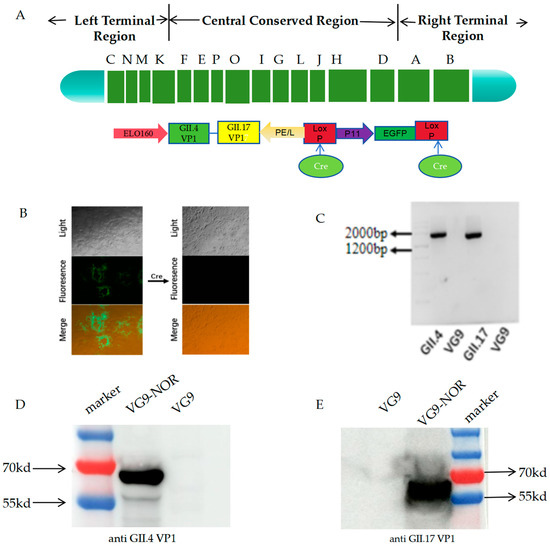 To construct the shuttle vector, the VP1 coding sequences of GII.4 [GenBank: AID60887.1, Hu/GII.4/Beijing/PKUPH-07-02/inpatient/2013/CHN] and GII.17 [GenBank: YP_009518836.1, Norovirus Hu/GII.17/HKG/2014/CUHK-NS-456] were codon-optimized and inserted into plasmids with the inducible promoters ELO160 [33] and PE/L [34]. The plasmid also contained a P11-induced late-expression enhanced green fluorescent protein (EGFP) as a screenable marker, both ends of EGFP containing a LoxP sequence [35]. To ensure the plasmid was inserted between the TJ2R and TJR3 sites of the VG9 strain, both ends of the constructed fragments carried an 819 bp TJR homologous sequence in the PE/O-NOR [GENERAL BIOL synthetic] and Cre [Cyclization Recombination Enzyme] plasmids (GENERAL BIOL synthetic).