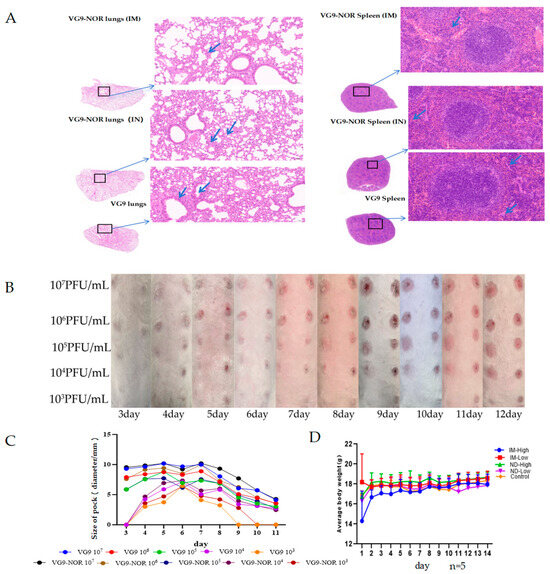 The TTV-derived VG9 strain has low toxicity and causes fewer side effects [32]. To evaluate the safety of VG9 and VG9-NOR, we conducted pathological sectioning, rabbit skin pockmark test, and body weight analysis in mice after vaccination. Firstly, 14 days after a single dose of the vaccine, we performed pathological sectioning on the heart, liver, spleen, lung, kidney, and brain of mice. Figure 3A shows the pathological results of the lung and spleen following intramuscular vaccination with VG9-NOR, intranasal VG9-NOR, and VG9 (see Supplementary Materials). There were no obvious lesions in the lungs and spleen, with only slight lymphocyte infiltration. This suggests that the pathological changes caused by VG9 and VG9-NOR in mice are minimal. Secondly, we carried out the rabbit pockmark test, which revealed that there was no significant difference in the size of the pockmarks formed by the two viral strains, but the pockmarks induced by low-dose VG9-NOR receded faster in the last three days (Figure 3B,C). This may be due to a slightly weaker replication ability of VG9-NOR in rabbit skin caused by the insertion of exogenous genes. Lastly, we further analyzed the impact of VG9-NOR and VG9 on the body weight of mice (Figure 3D). The results showed that the changes in the body weight of mice were not significant, indicating that VG9 and VG9-NOR had a minimal impact on the general health of mice. In conclusion, VG9-NOR showed a similar safety profile to VG9 in rabbits and mice. These results suggest that VG9-NOR, as a vaccine candidate strain, has good safety and a low risk of side effects in the animal model tested.