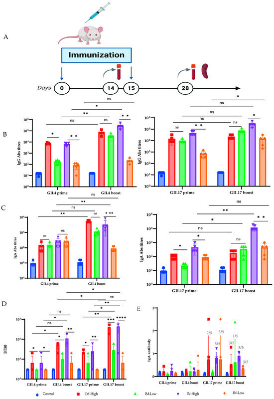 The 96-well plates [Corning:3590] were coated with 1 μg/mL GII.4 and GII.17 VLP, 100 µL per well, and incubated at 4 °C overnight. The coated plates were then blocked with 5% skimmed milk. After 2 h, the plates were washed with PBST [containing 0.05% Tween 20], after which the mouse serum was added to the plate and incubated for 1 h at 37 °C. Subsequently, the plates were washed 3 times, after which the HRP-labelled goat-anti-mice IgG [Boster: BA1050]/Goat Anti-Mouse IgA alpha chain (HRP) [Abcam: ab97235] was added and incubated for 1 h, and then washed 5 times. Following the addition of 100 µL TMB [3,3′,5,5′-Tetramethylbenzidine] substrate I [Biomart:TMB-S-001], the plate was incubated at 37 °C for 25 min, after which the reaction was terminated by adding the stop buffer [Solarbio:C1059] and the absorbance at 450 nm (A450) was measured. The binding antibody titer was defined as the reciprocal of the highest serum dilution [absorbance ≥ 2.1 OD450 units higher than the control].