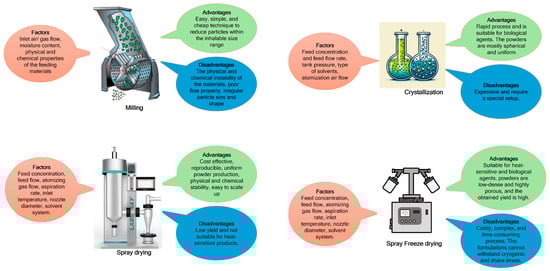 Each of these techniques has its own advantages and limitations (Figure 1). Process parameters must be carefully optimized to ensure successful DPI development. The selection of a suitable technique depends on the physicochemical properties of the drug and its intended pulmonary delivery application.