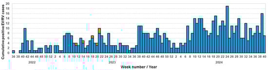 Weekly distribution of the 208 cumulative positive EV/RV cases in 2022 and 2024. EV-C105s are identified in orange.