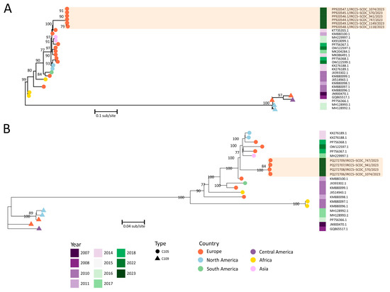 Phylogenetic trees based on partial VP1 (A) and whole-genome nucleotide sequences (B) with all available Enterovirus C105 genome sequences. The heatmap indicates the sampling date (2007–2023), while each node is colored according to the origin continent (Europe, Northern America, Southern America, Africa, Asia). The robustness of the branches is shown on the label nodes with bootstrap values (bootstrap support cutoff, ≥70%). The units of branch length are the number of substitutions divided by the length of the sequence. Enterovirus C109 sequences were used as outgroups.