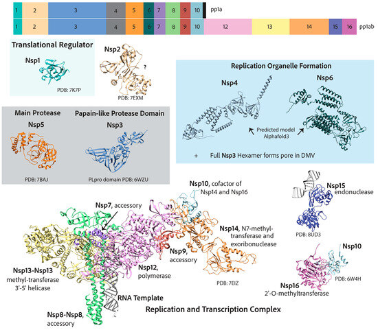 - Yan, L.; Ge, J.; Zheng, L.; Zhang, Y.; Gao, Y.; Wang, T.; Huang, Y.; Yang, Y.; Gao, S.; Li, M.; et al. Cryo-EM Structure of an Extended SARS-CoV-2 Replication and Transcription Complex Reveals an Intermediate State in Cap Synthesis. Cell 2021, 184, 184–193.e10. [Google Scholar] [CrossRef] [PubMed]