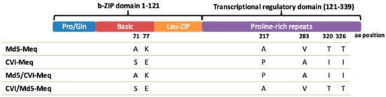 - Ajithdoss, D.K.; Reddy, S.M.; Suchodolski, P.F.; Lee, L.F.; Kung, H.J.; Lupiani, B. In vitro characterization of the Meq proteins of Marek’s disease virus vaccine strain CVI988. Virus Res. 2009, 142, 57–67. [Google Scholar] [CrossRef] [PubMed]