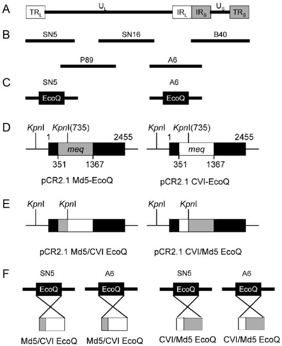 Generation of cosmid clones and recovery of recombinant viruses. MDV cosmid clones SN5, P89, SN16, A6, and B40 from the very virulent (vv) strain Md5 were used to generate recombinant Md5 viruses [27] (Figure 2A,B). The EcoQ fragment located in cosmid clones SN5 and A6 contains the meq gene (Figure 2C) and was replaced with Md5/CVI or CVI/Md5 EcoQ fragments using a previously described strategy [21,27,28]. Briefly, the Md5 EcoQ fragment was released from cosmid clones SN5 and A6 using the recA-assisted restriction endonuclease (RARE) method and was subsequently cloned into the pCR2.1 vector (Invitrogen, Carlsbad, CA) to generate pCR2.1 Md5-EcoQ. EcoRI-digested SN5 and A6 cosmid clones were re-ligated, generating SN5ΔEcoQ and A6ΔEcoQ. pCR2.1 CVI-EcoQ containing the EcoQ fragment from vaccine strain CVI988/Rispens was constructed following the same procedures. pCR2.1 Md5-EcoQ and pCR2.1CVI-EcoQ vectors were digested with KpnI (Figure 2D) and the released fragments swapped to generate pCR2.1 Md5/CVI-EcoQ and pCR2.1 CVI/Md5-EcoQ (Figure 2E). Plasmids containing chimeric EcoQ fragments were then digested with EcoRI and the released fragment was cloned into A6ΔEcoQ and SN5ΔEcoQ to generate A6-Md5/CVI-Meq, SN5-Md5/CVI-Meq, A6-CVI/Md5-Meq, and SN5-CVI/Md5-Meq (Figure 2F).