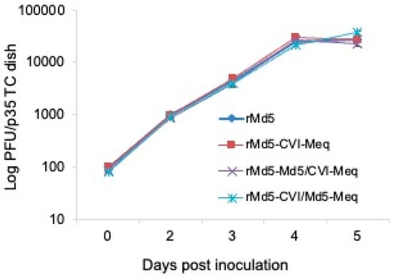 In vitro and in vivo growth properties of Meq recombinant viruses. Meq is non-essential for MDV replication [19]. To investigate whether chimeric Md5/CVI-Meq or CVI/Md5-Meq had any effect on MDV in vitro replication, DEF in 35 mm dishes were infected with 100 plaque-forming units (PFU) of rMd5, rMd5-CVI-Meq, rMd5-Md5/CVI-Meq, and rMd5-CVI/Md5-Meq viruses. As expected, the in vitro growth properties of all chimeric viruses were comparable to those of parental rMd5 at all time points studied (days 2, 3, 4, and 5) (Figure 3), confirming that none of the Meq proteins examined affected viral replication in vitro.