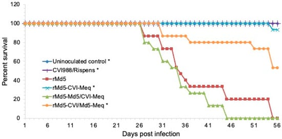 Survival curve of parental and chimeric viruses (Experiment 1). Specific pathogen-free chickens were inoculated with 5000 PFU of the indicated viruses and were maintained in isolation units for 8 weeks. The daily mortality pattern for each virus was recorded and the survival percentage for each group is shown on the Y-axis. Trends of chicken survival over time were examined with LogRank and Wilcoxon tests. A value of p < 0.05 was considered statistically significant when compared to the parental rMd5 virus. * = p < 0.001.