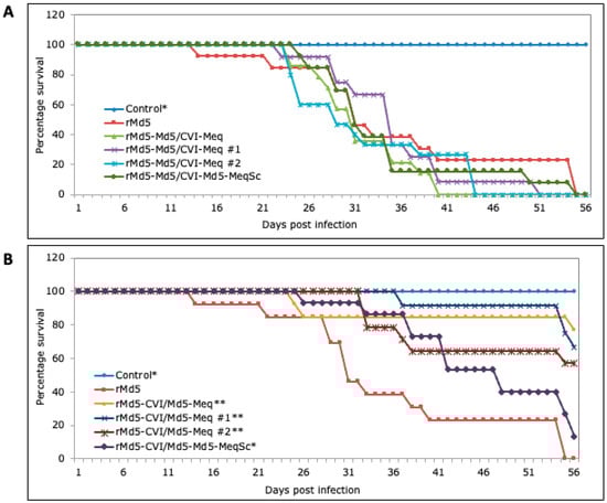 Survival curves of parental, chimeric, and single-copy revertant viruses (Experiment 2). Specific pathogen-free chickens were inoculated with 5000 PFU of the indicated viruses and were maintained in isolation units for 8 weeks. Control groups consisted of chickens inoculated with parental rMd5 virus, as well as uninoculated chickens. The daily mortality pattern for each virus was noted and the survival percentage for each virus is shown on the Y-axis. (A) Survival curves for uninoculated control group (control), rMd5 parental virus, and Md5/CVI-Meq recombinant viruses. (B) Survival curves for uninoculated control group (control), rMd5 parental virus, and CVI/Md5-Meq recombinant viruses. Trends of chicken survival over time were examined with LogRank and Wilcoxon tests. A value of p < 0.05 was considered statistically significant when compared to the parental rMd5 virus. * = p < 0.05 ** = p < 0.001.