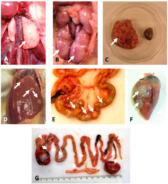 Visceral tumors in rMd5-Md5/CVI-Meq inoculated chickens. (A) Testicles; (B) ovary and kidney; (C) spleen with uninoculated control on the right; (D) liver; (E) tumors in the intestine; (F) heart; (G) gastrointestinal tract and spleen. Tumors are indicated by arrows. Visceral tumors caused by rMd5 and rMd5-CVI/Md5-Meq are too small to appreciate in a picture and are not shown.