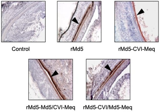 Viral replication in infected chickens’ feather follicular epithelium (FFE). The skin was collected from two randomly selected chickens in each group at the time of death or the end of the experiment, processed, and subjected to immunohistochemistry with mouse anti-pp38 monoclonal antibody to detect virus replication in FFE. Areas with virus replication are brown in color (black arrowhead). Representative images from each group are shown.