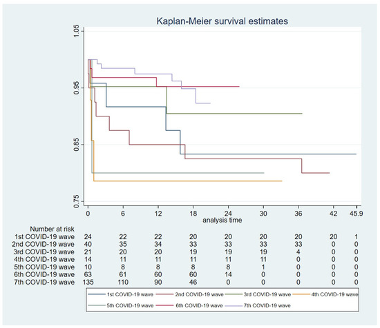 In our study, we observed that antimalarials, interferon, and kaletra were used during the first period in selected cases. When bacterial superinfection was suspected, empiric antibiotics were prescribed and later switched according to antibiogram. There was no immunosuppressive adjustment depending on the antibiotic administration, but all the patients had repeated immunosuppression level controls to maintain appropriate dosing during their hospitalization. Prophylactic anticoagulation was prescribed in 50% of the patients up to the fifth wave, with a decrease in the last two waves, following the same tendency as corticoid treatment.