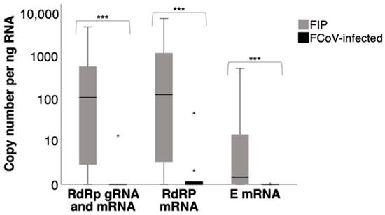 Comparison of viral RNA levels between cats with FIP (“FIP”; tissue samples with FIP lesions) and FCoV-positive cats without FIP (“FCoV-infected”; MLN samples) using three RT-qPCR assays. The box plots represent the distribution of RNA copy numbers for each group across three different assays: RdRp gRNA and mRNA, RdRp mRNA, and E mRNA. The central line in each box indicates the median, while the box itself represents the interquartile range (IQR: 25th to 75th percentiles). Whiskers extend to the smallest and largest values within 1.5 times the IQR, and any data points outside this range are shown as outliers (*). Copy numbers (log scale) per ng RNA. Mann–Whitney U test. ***: asymptotic significance <0.001.