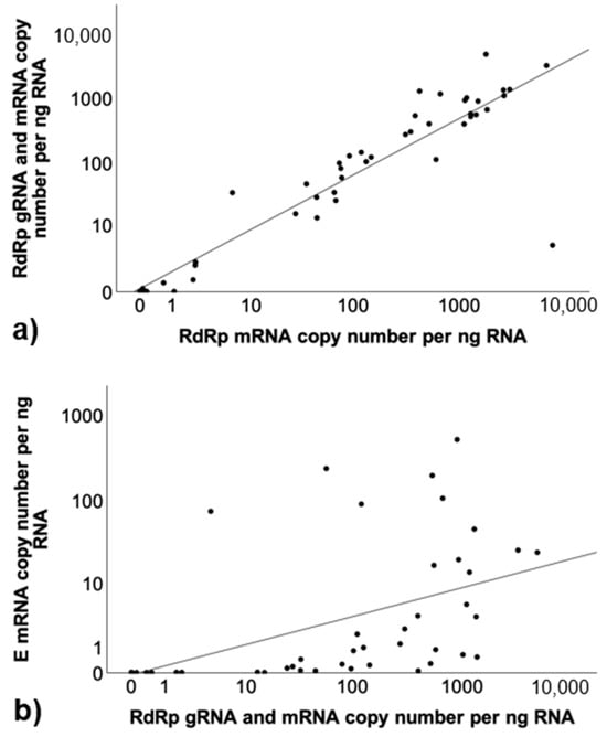 The efficiency and R2 values (a measure of linearity in standard curves) for the three assays are summarized in Supplementary Table S3. All assays showed good linearity, with R2 values above 0.98. The RdRp gRNA and mRNA assay had lower efficiency (75.79%) than the RdRp mRNA and E mRNA assays (105.04% and 99.83%, respectively). These efficiency values for the RdRp gRNA and mRNA and RdRp mRNA assays were obtained from the duplex assays.