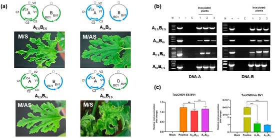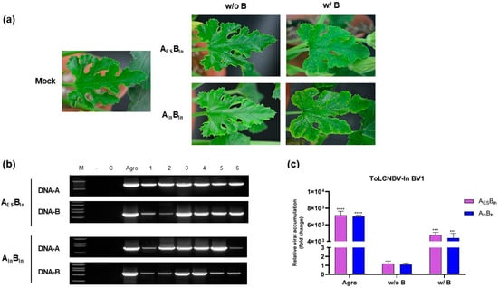 Additionally, quantitative PCR (qPCR) was conducted on agro/sap-inoculated plants at 28 dpi to determine relative viral accumulation. Total DNA from the new leaves of the three plants was extracted and used as a template for qPCR as described in our earlier study [23]. The AC1 gene was used to check for DNA-A, and the BV1 gene was used to check for DNA-B.