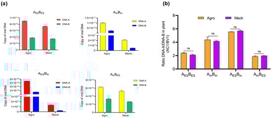 Quantities of ToLCNDV DNA-A and DNA-B under different agro/sap inoculations and their ratio in zucchini plants. Zucchini plants were inoculated with 4 different combinations (AESBES, AInBIn, AESBIn, and AInBES) and sampled at 28 dpi. Quantitative viral DNA (expressed in copies/μL) using a standard curve of samples via agro-inoculation (Agro) and mechanical transmission (Mech) for DNA-A and DNA-B (a) and the DNA-A/DNA-B ratio (b). The AC1 and BV1 genes were used to check for DNA-A and DNA-B, respectively. Values are means ± SD, ns indicates not significant.