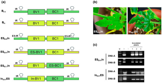 DNA-B chimeric clones in zucchini via mechanical transmission. Four chimeric clones were synthesized and transformed to agrobacteria to generate a series of DNA-B mutant clones. These clones include ESBIRIn (IR of ToLCNDV-ES DNA-B in ToLCNDV-In backbone), ESBV1In (ToLCNDV-ES BV1 gene in ToLCNDV-In backbone), ESBC1In (ToLCNDV-ES BC1 gene in ToLCNDV-In backbone), and InBV1ES (ToLCNDV-In BV1 gene in ToLCNDV-ES backbone). (a) Genome map of different chimeric clones based on DNA-B sequence. (b) Phenotype of ESBV1In and InBV1ES at 28 dpi. (c) PCR results of inoculated zucchini. Lane M: ladder (1 kb for ESBV1In DNA-A and 100 bp for others), lane +: positive control, lane −: negative control, lanes 1–3: inoculated plants.