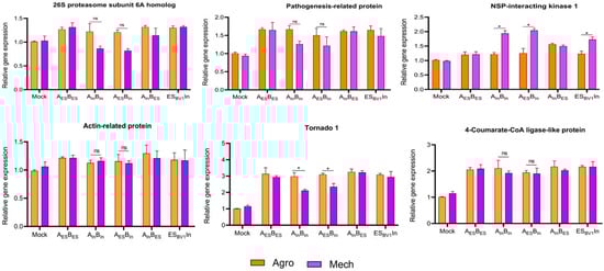 Relative expression levels of some host defense genes probably related to mechanical transmission in zucchini. The new leaves of mock and infected plants (wildtype: AESBES, AInBIn; swapped genome: AESBIn, AInBES; and mutant clones: ESBV1In, InBV1ES) under agro- and sap-inoculated zucchini were collected at 28 dpi. qRT-PCR was conducted to check the relative expression of 6 genes including 26S proteasome, pathogenesis-related, actin−related, tornado 1, NSK 1, and 4−coumarate−CoA ligase in agro-inoculated plants (Agro), and sap-inoculated plants (Mech). The data are presented as the mean ± standard deviation, * p < 0.1, ns: not significant.