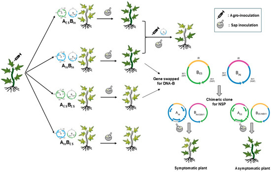 In this study, DNA-B was used to construct chimeric clones. Three chimeric sequences, comprising the intergenic region (IR) and two ORFs (BV1 and BC1) of ToLCNDV-In DNA-B on a ToLCNDV-India backbone (designated as ESBIRIn, ESBV1In, and ESBC1In, respectively), were synthesized (Macrogen, Seoul, Republic of Korea) based on the sequences of two ToLCNDV isolates with tandem repeat constructs. The recombinant plasmid was obtained by ligating the pCAMBIA 1303 vector with the synthesized sequences digested with HindIII/SpeI. Similarly, a recombinant plasmid with the swapped sequence of ToLCNDV-In BV1 on the ToLCNDV-ES backbone (InBV1ES) was obtained. Recombinant plasmids were transformed into Agrobacterium tumefaciens strain GV3101 by freeze–thaw transformation. All chimeric clones were tested for infectivity in N. benthamiana and zucchini via agro-inoculation and mechanical transmission.