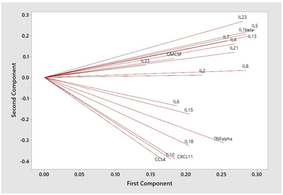 The variables chosen and measured were chemokine (C-C motif) ligand 20 (CCL20), CCL3, CCL4, CX3CL1, CXCL11, granulocyte–macrophage colony-stimulating factor (GMCSF), interferon IFN-α2, IFN-β, and IFN-γ, and interleukin IL-1β IL-2, IL-4, IL-5, IL-6, IL-7, IL-8, IL-10, IL-12(p70), IL-13, IL-15, IL-17A, IL-18, IL-21, IL-23, IL-33, and TNF-α.