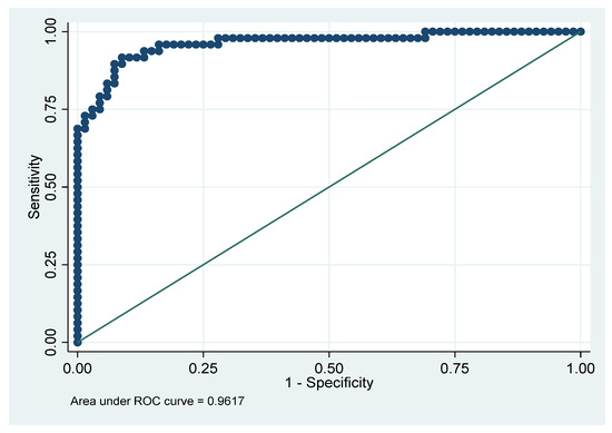 A logistic regression model was developed using only the first two PCA variables (Table 4) to predict a binary variable (MIS-C = 1; controls = 0). The respective ROC curve is given in Figure 3. The fit of the model was very good, with the following characteristics: sensitivity = 83%; specificity = 94%; false+ = 9%; false− = 11%; correctly classified = 90%; and AUC = 96%.