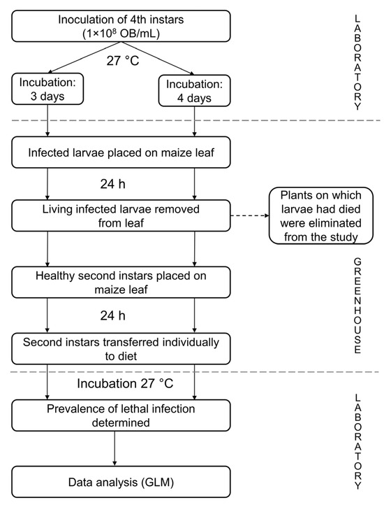Maize plants (Zea mays) hybrid variety H-318 (Codegram, Tenencia, Mexico) were grown individually in soil in 250 mL polystyrene cups in a greenhouse. A generic granular fertilizer (NPK 17:17:17) was applied when plants were approximately 10 cm in height. Fourth instars of S. frugiperda were inoculated with 1 × 108 OBs/mL and incubated for either three or four days at 27 ± 0.5 °C, as described in Section 2.2. Control larvae were treated identically but were inoculated with sucrose solution alone. At three or four days post-inoculation (Figure 1), larvae were placed individually on the leaf of a maize plant (30–40 cm height) and confined within a cage comprising a plastic Petri dish cage with a 3 mm layer of polyethylene–vinyl acetate sponge as the floor. The dish was held together with an elastic band so that each larva was exposed to a 9 cm length of leaf for a period of 24 h. Plants on which larvae died from polyhedrosis disease during the 24 h greenhouse period were excluded from the experiment. For larvae that were alive after this period, each infected larva was removed, and a group of four second-instar larvae was placed on the exposed leaf section for an additional period of 24 h (Figure 1). To determine the prevalence of virus transmission, larvae were then transferred individually to the wells of a 24-well cell culture plate with a piece of diet, taken to the laboratory and incubated at 27 ± 0.5 °C until death or pupation. Virus-induced deaths were confirmed by observation of OBs in Giemsa-stained smears of larval tissues. The prevalence of lethal polyhedrosis disease in the second instars that were exposed to the feces of infected fourth-instar larvae was subjected to statistical analysis (Section 2.6).